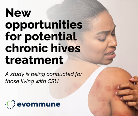 Current StudiesWe are currently recruiting participants for the following studies: Evommune CSU (EVO756) StudyChronic Hives Study Now Enrolling Volunteers Learn more Interested in participating in future clinical trials? Would you like to know when new trials become available? Please join our mailing list by filling out the form below. A Research Coordinator will contact you when new trials become available. First Name Last Name Email Address Sign Up Thank you. You have now joined our clinical studies mailing list.